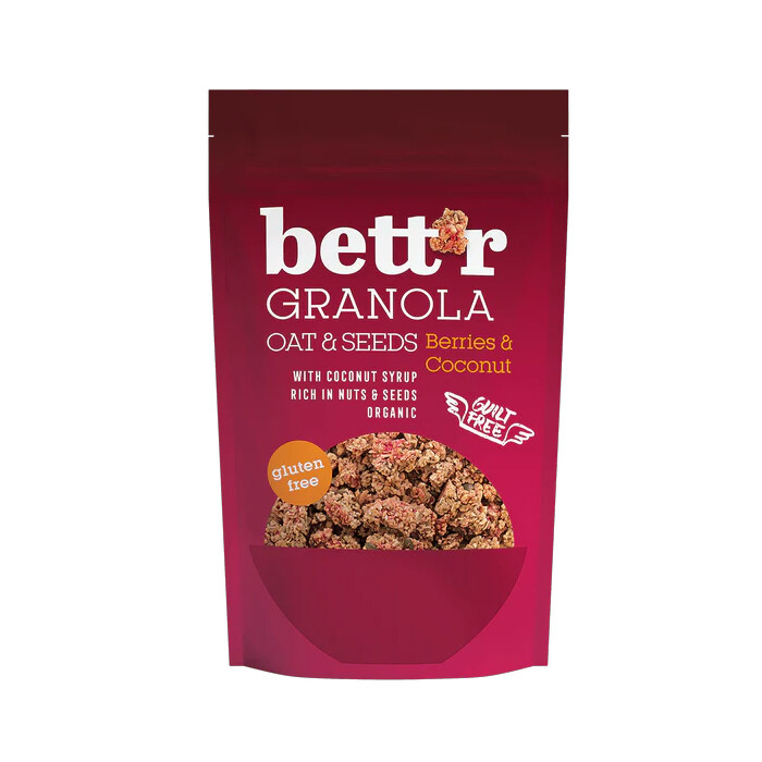 Deze granola zit boordevol voedzame ingrediënten, perfect voor een goede start van de dag: glutenvrije havervlokken, diverse noten en zaden, gedroogde bessen en kokosvlokken, allemaal gemengd met een heerlijke combinatie van kokosnectar en rijstsiroop. Gebakken tot een perfect knapperige textuur met een aantrekkelijke goudbruine kleur.