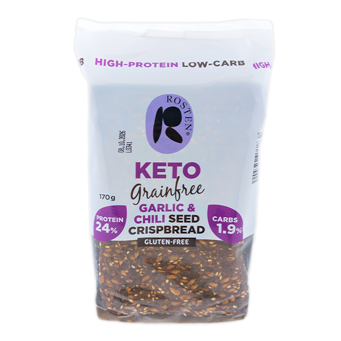 Try now the Rosten KETO Garlic & Chili Crispbread a keto-friendly seed crispbread (näckebröd) with garlic & chili. These crispbreads are low in fat and high in proteins, it is the perfect bread replacement without the unnecessary additions.